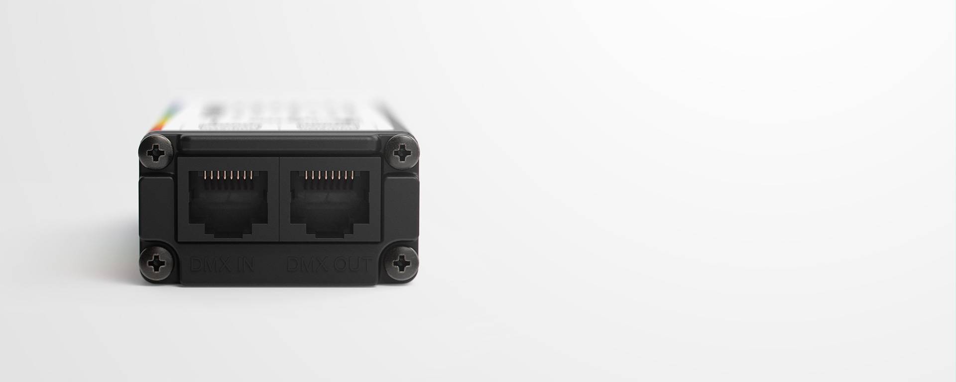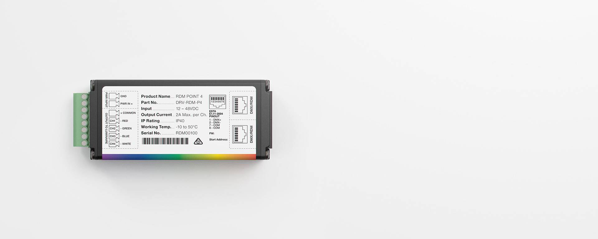 Use RDM Point 4 to interface between a remote standard DMX/RDM source and Coolon luminaires, driving up to 8 amps of constant voltage RGB or RGBW LED fittings. The lights and external power supply are conveniently connected using easy plug screw terminals on the output side. Input and RJ45 terminals are also provided on the interface side for DMX bus connections.