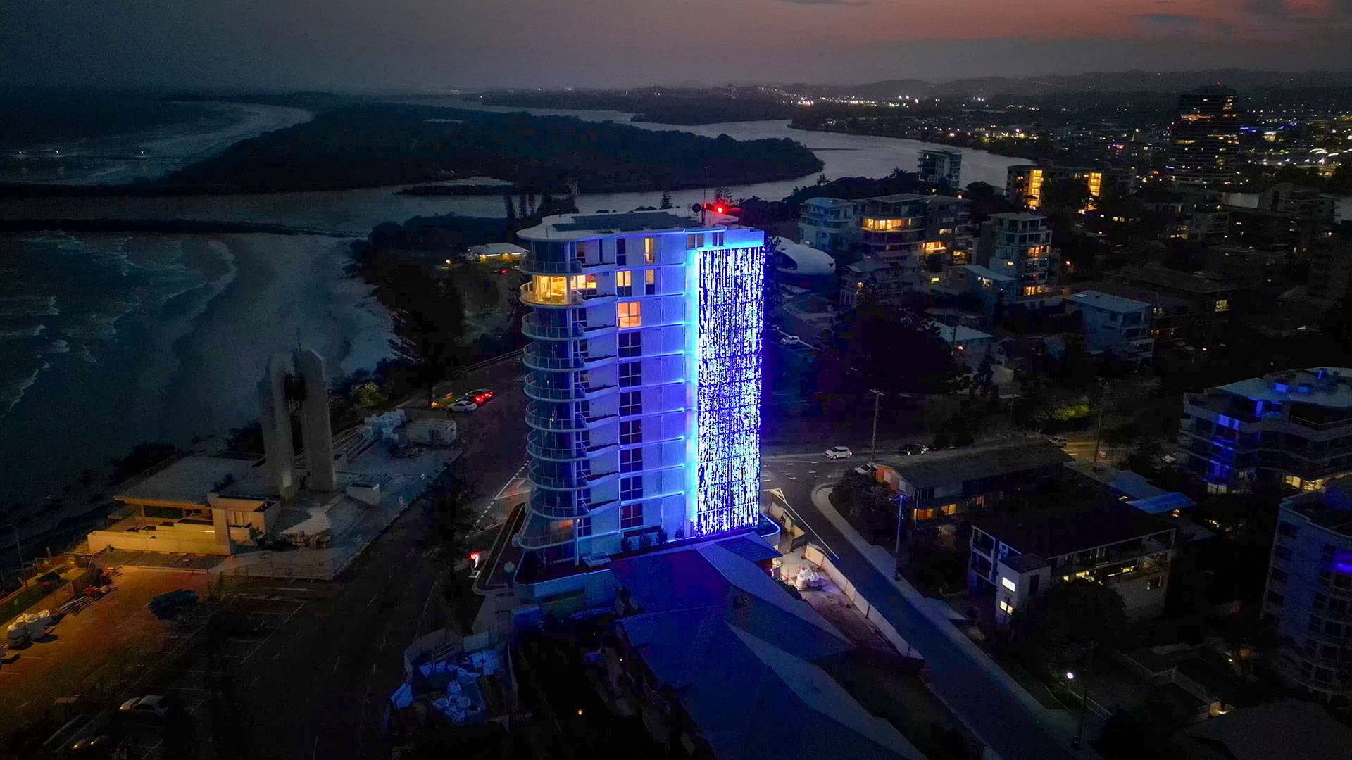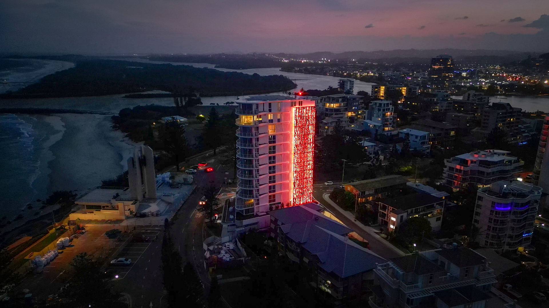 The Aria RGBW luminaire elegantly bathes the Awaken residence facade in a dynamic spectrum of colours, enhancing the artwork with vibrant hues and creating a captivating and immersive ambiance.