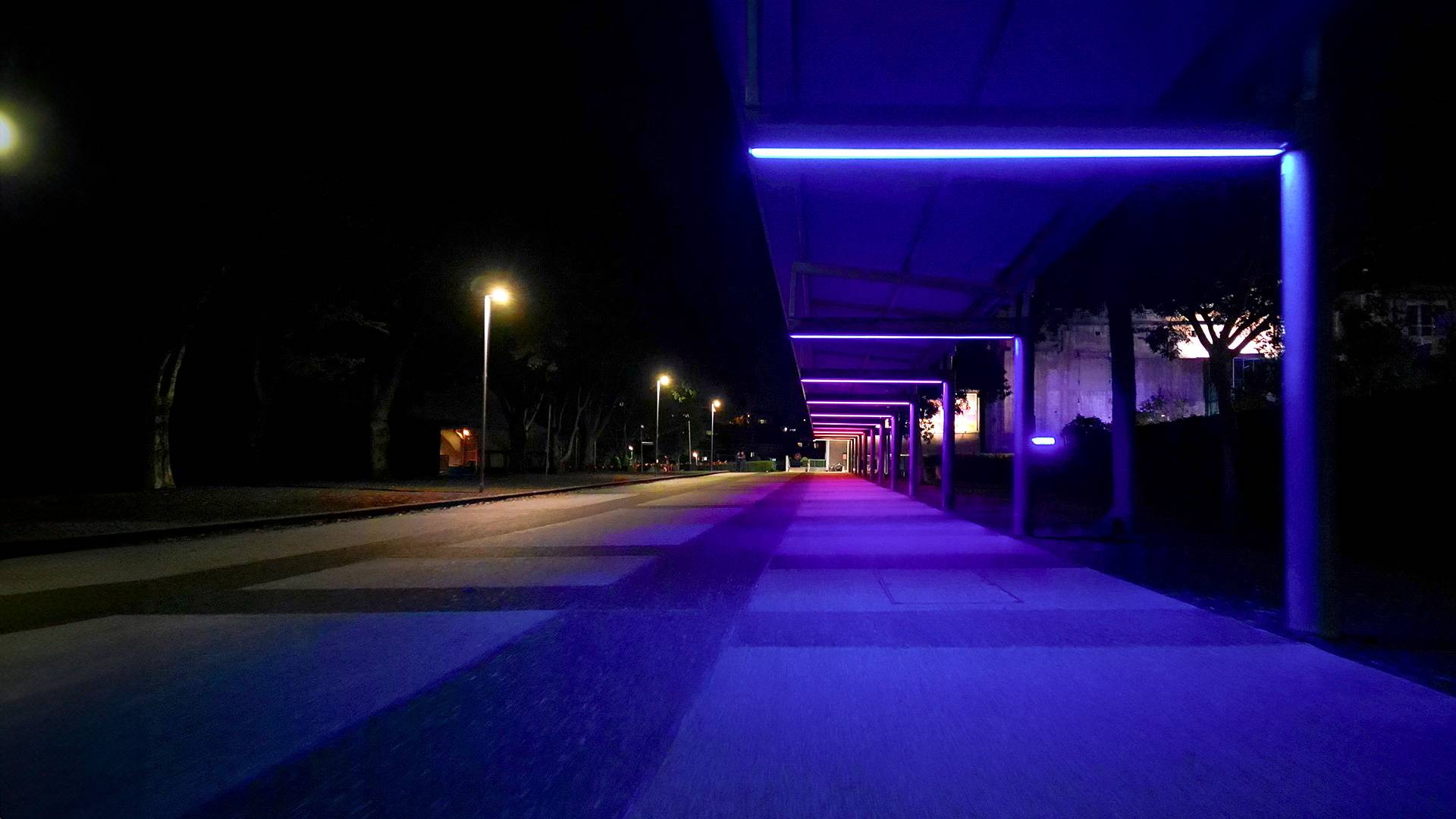 Spectrum RGBW IP luminaires are positioned beneath the awning, forming precise linear accents while projecting vivid, colourful light onto the boardwalk below. These IP66 and IK08 rated luminaires are engineered for durability, making them an ideal choice for high-traffic outdoor environments.