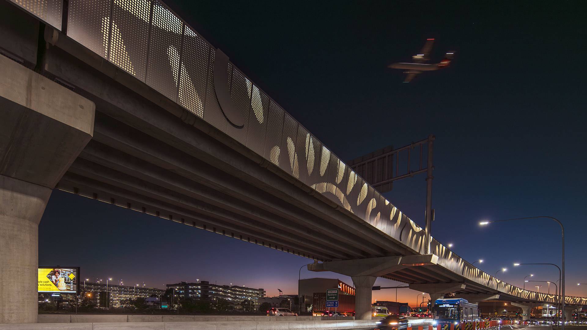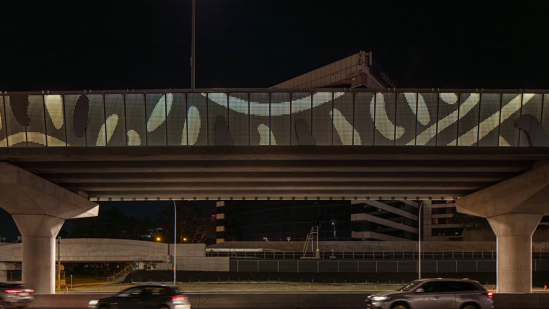 Follow the glistening of the sun’ is a prominent artwork displayed on the viaduct screens of the Overpass bridge. Enhancing the contemplative essence of the artwork and aiding commuter experience, flecks of golden light radiate brilliantly through the mesh walls, continuously illuminating and enlivening the bridge. Coolon’s Ratio IP, spanning 1100 meters, was the ideal choice due to its durability and excellent optical control.
