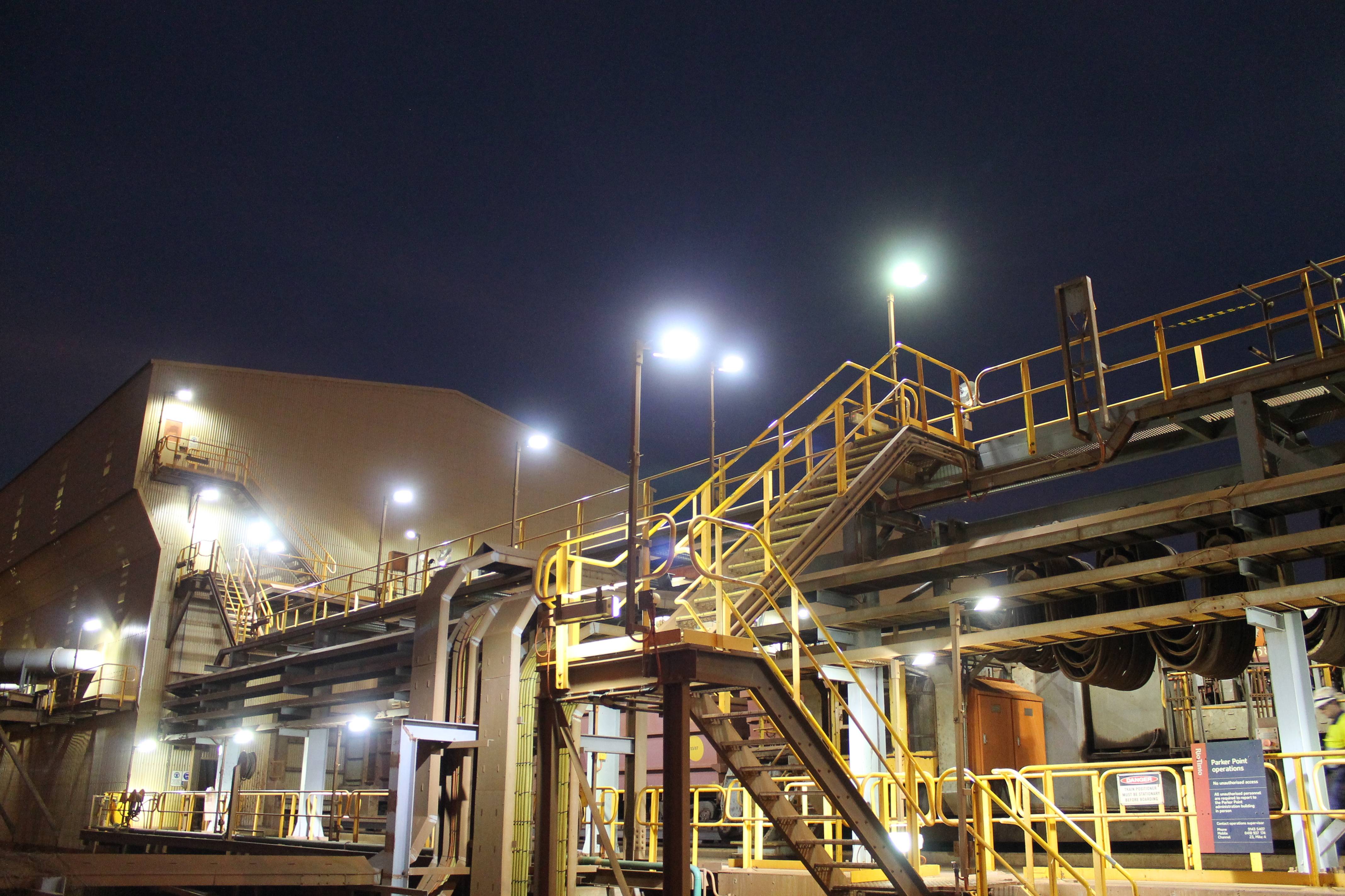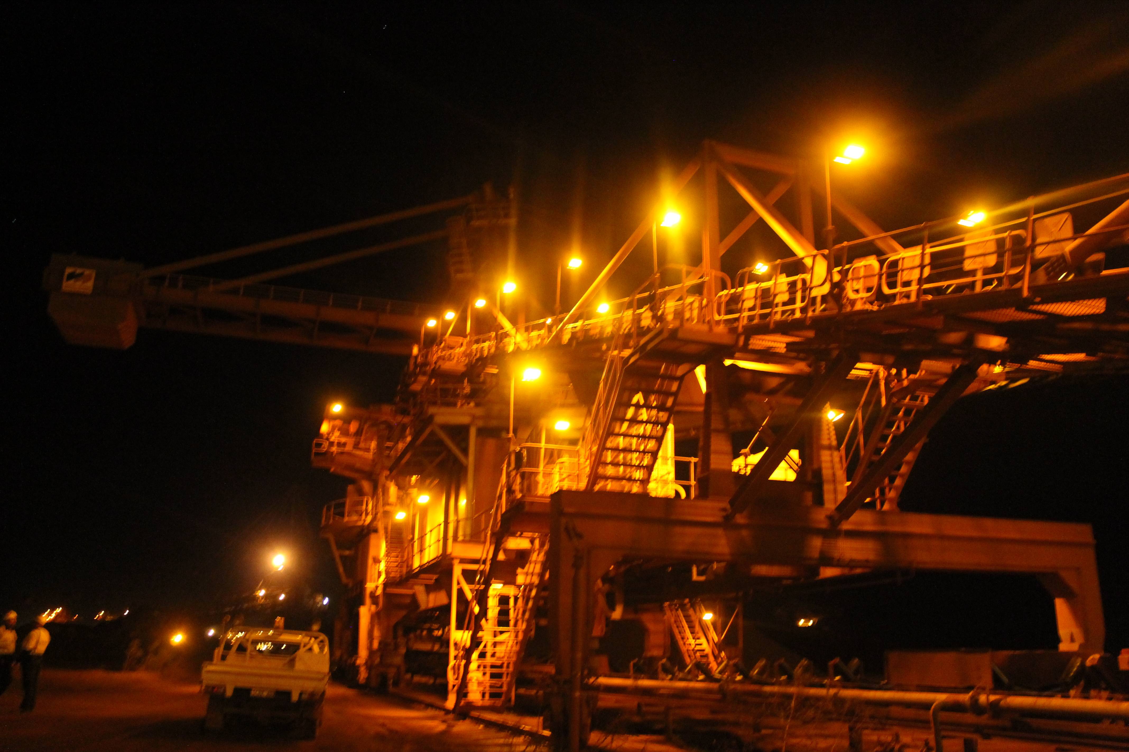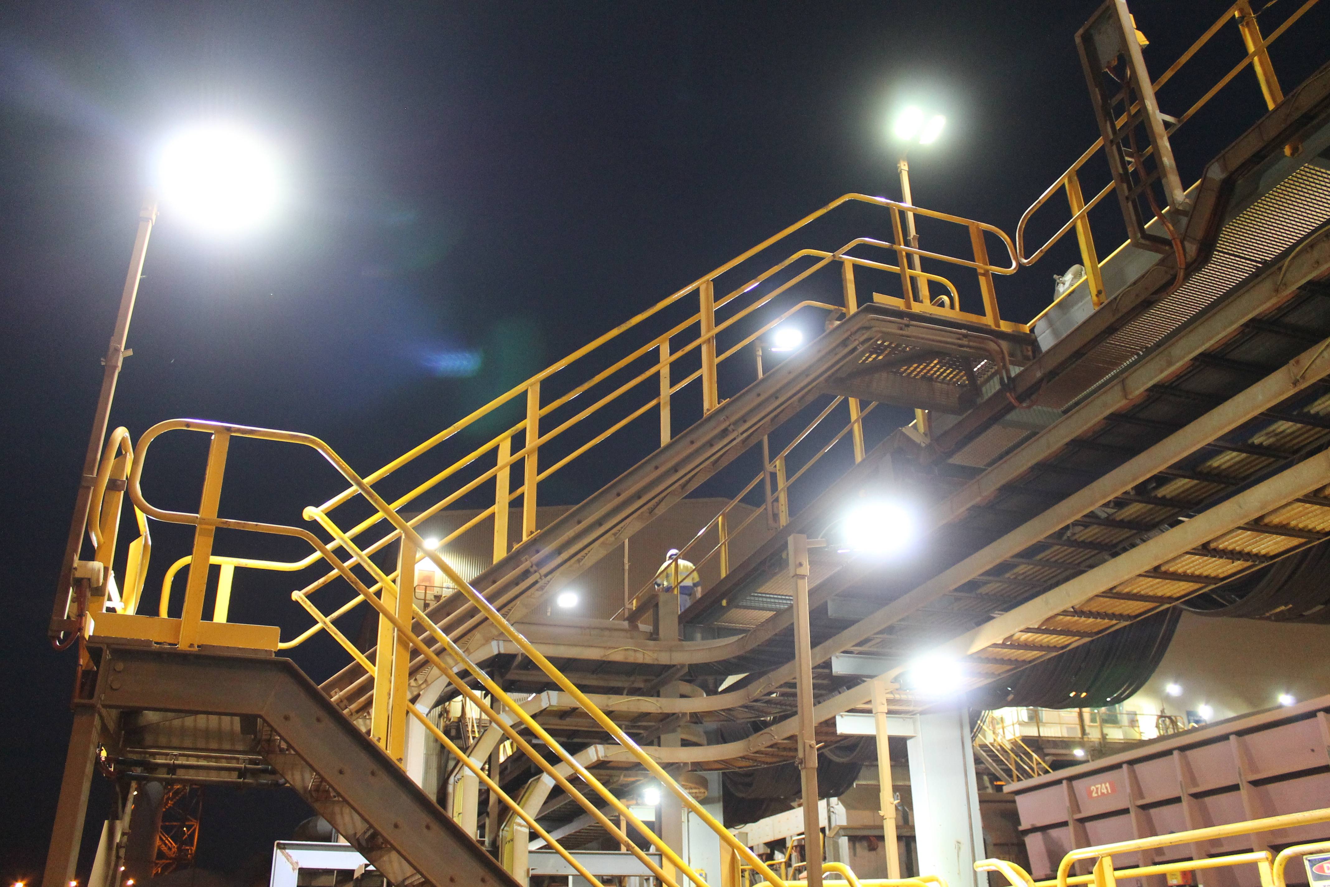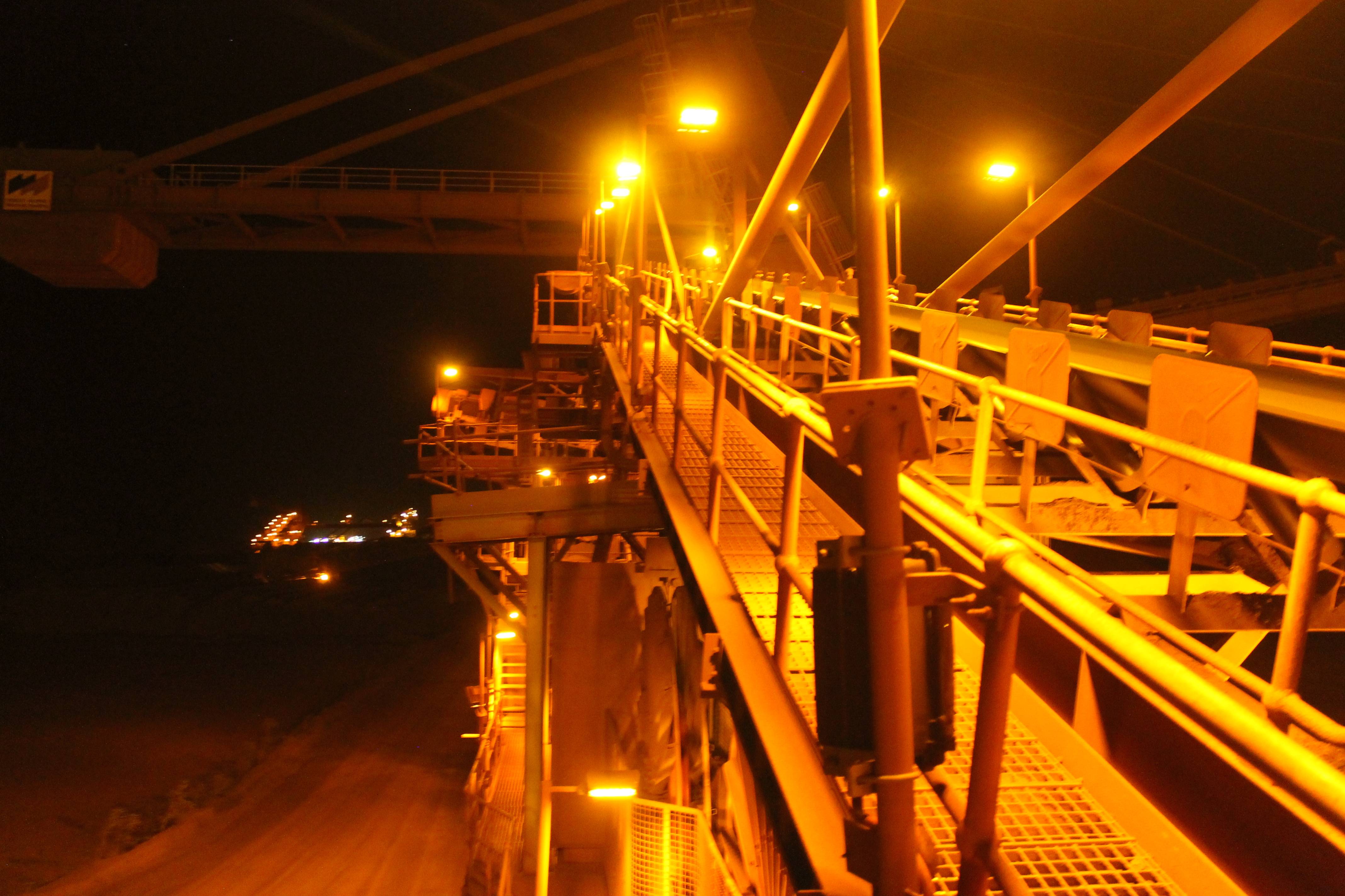 Coolon DLKs installed on a stockpiling stacker reclaimer and a train loader facilities on an Iron Ore port in Coastal Pilbara, featuring turtle-friendly amber CRI.
