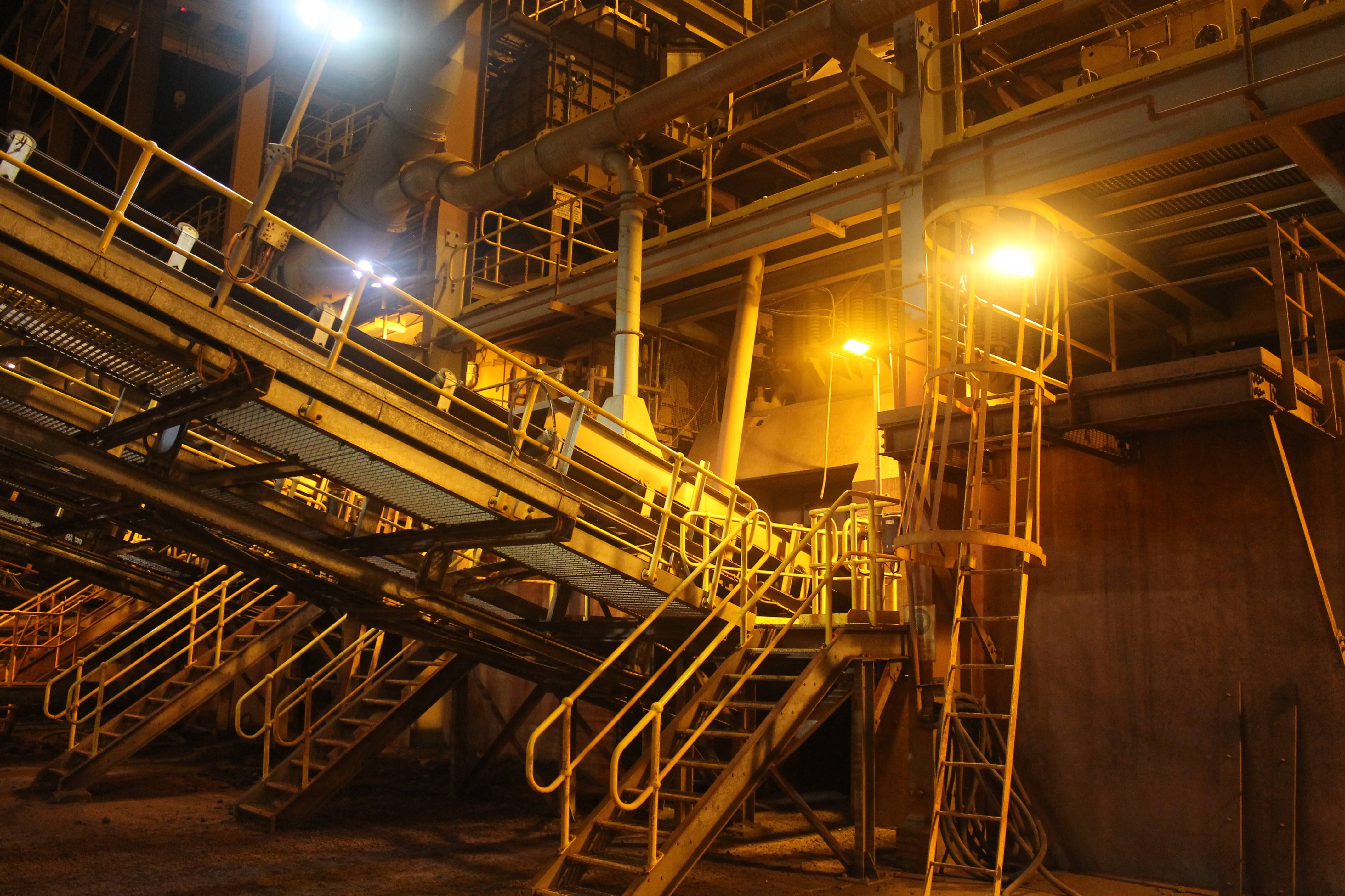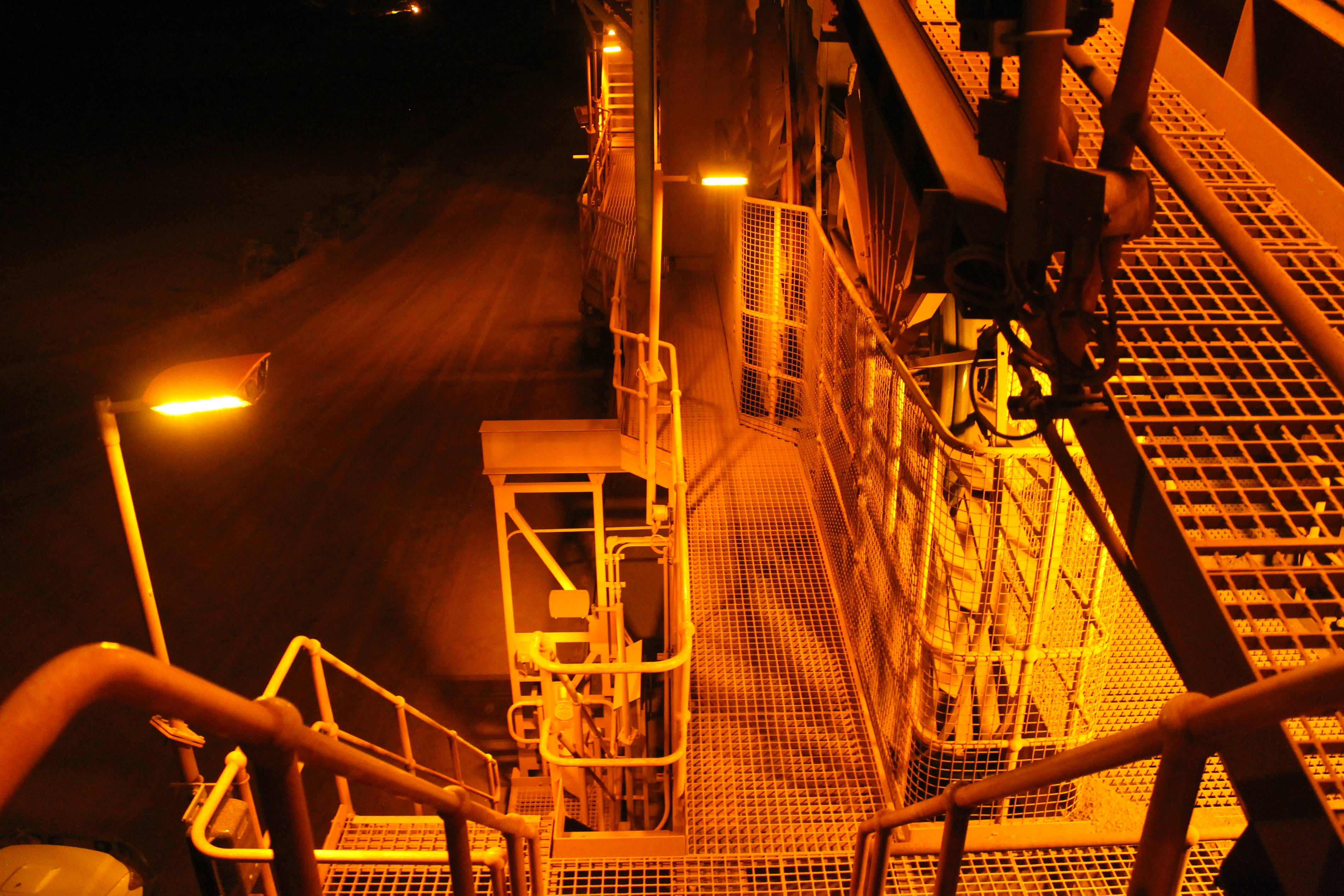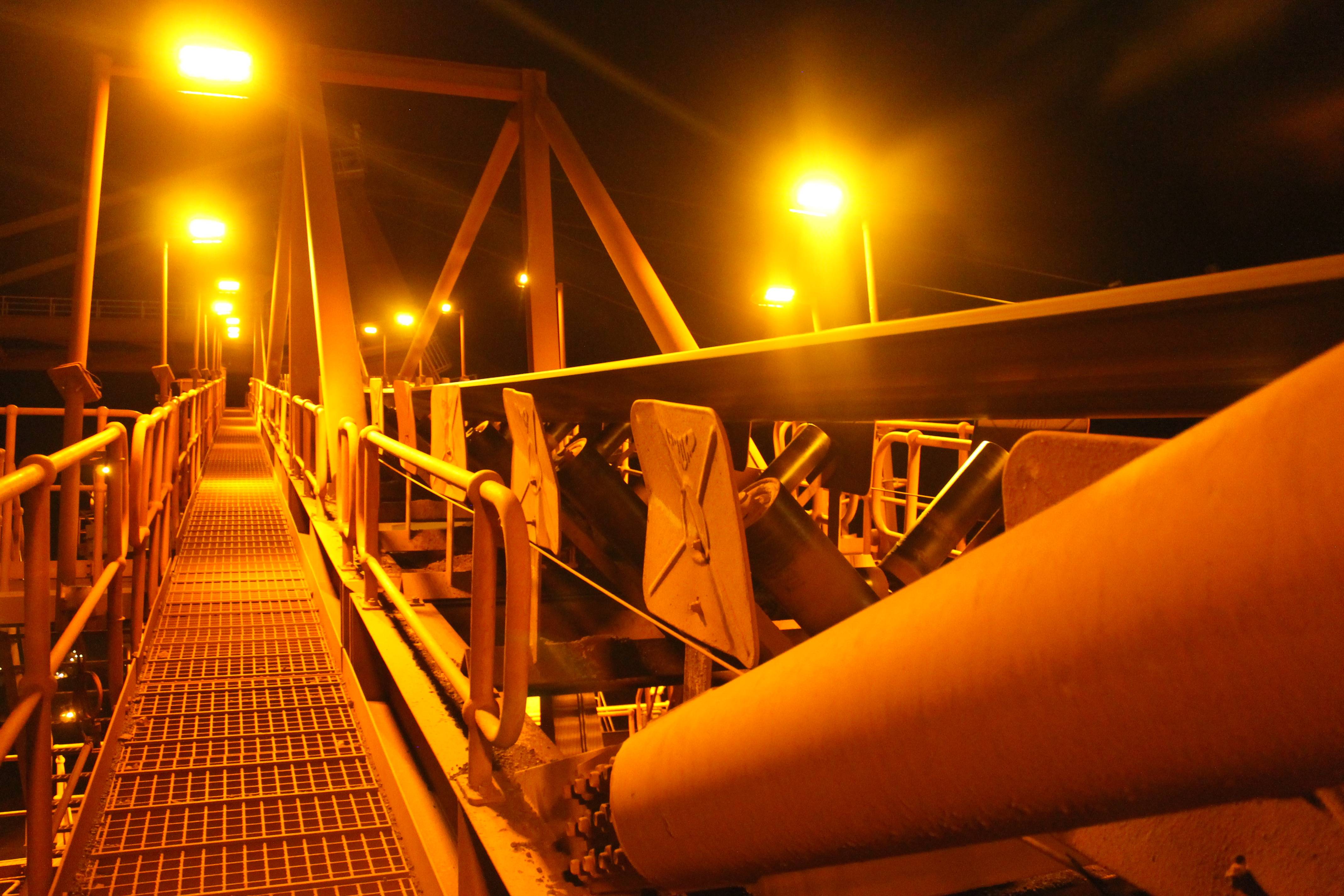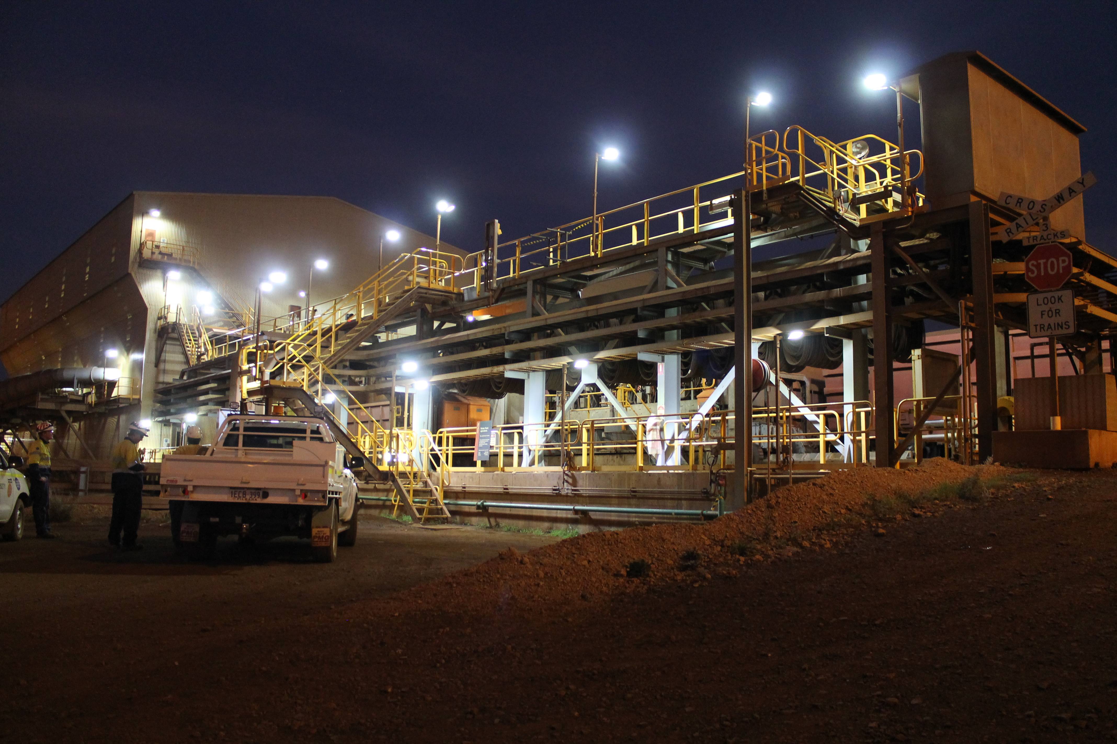 Coolon DLKs installed on a stockpiling stacker reclaimer and a train loader facilities on an Iron Ore port in Coastal Pilbara, featuring turtle-friendly amber CRI.
