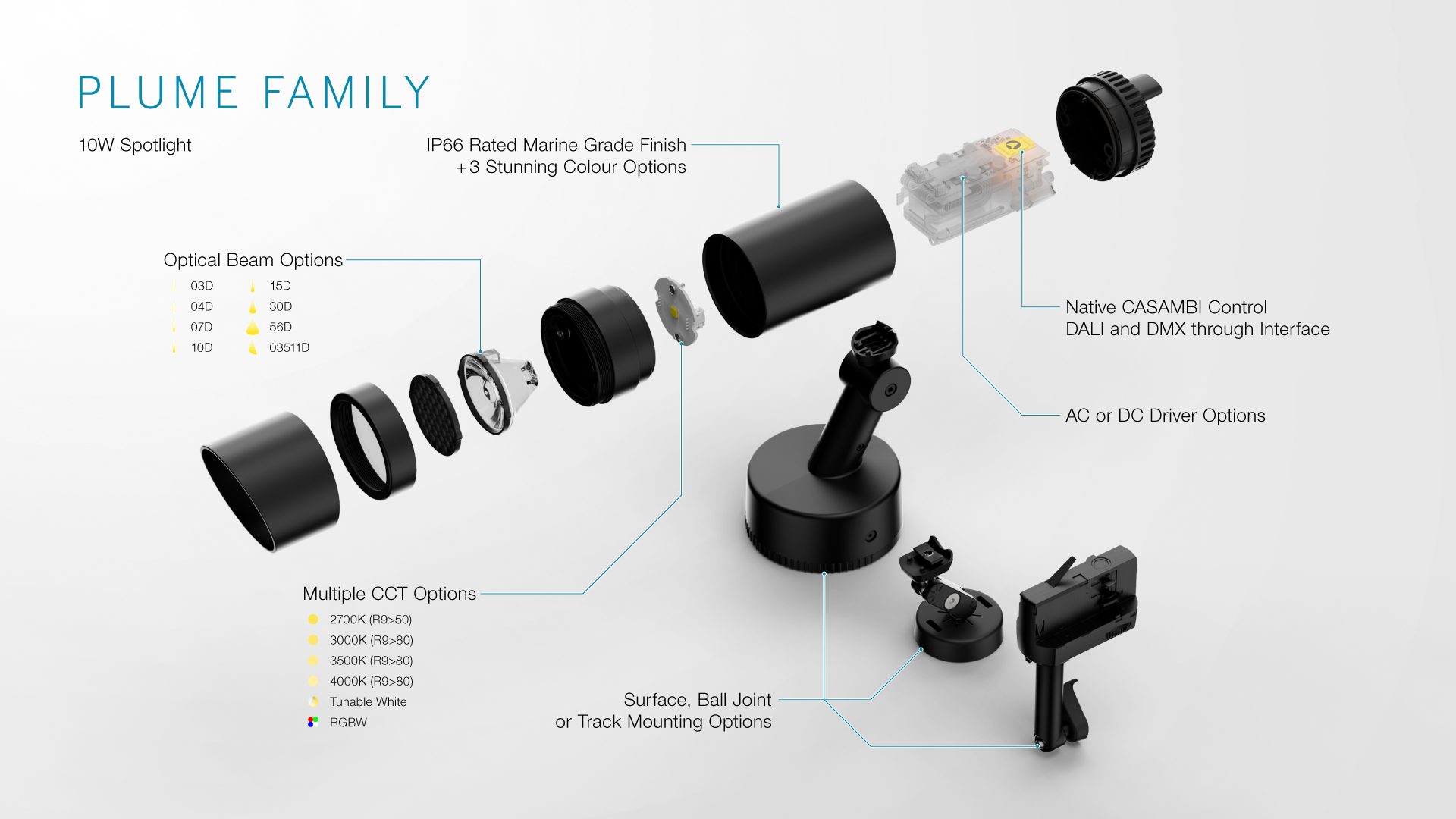 Available in AC with an integrated power supply or DC for flexible system integration, PLUME SW adapts seamlessly to a wide range of architectural and landscape applications. Wireless control via on-board Casambi Bluetooth enables effortless commissioning and fine-tuning using a smartphone or tablet, removing the complexity of traditional control systems while retaining professional-level precision. For larger or more complex installations, DALI or DMX control is easily achieved via external converters.